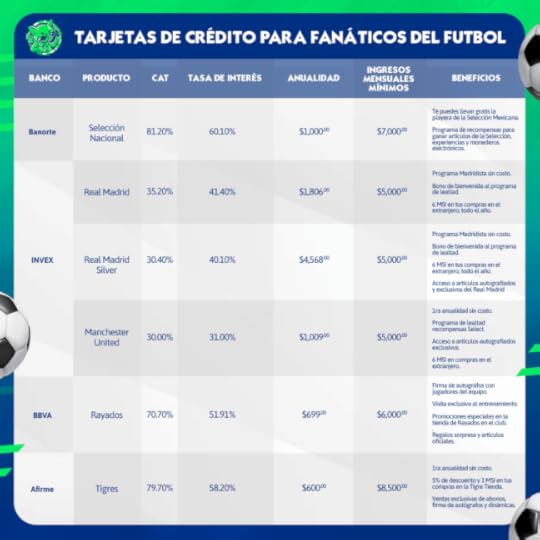 Tu tarjeta de crédito no es tu fondo de emergencia. Puede ayudarte para saldar una deuda rápido, sobre todo si tu fondo está a 28 días, pero si la ocupas sin pensar, seguro terminarás en un problema.Tampoco es una extensión de tus ingresos. No gastes por arriba de tus posibilidades, así empiezan las deudas y luego no sabes cómo salir de ellas.Anota tu fecha de corte y tu fecha de pago. Con la Agenda de Retos 2023 y sus stickers es fácil mantener este control y que nunca se te pase una fecha importante otra vez.Sé siempre totalero o totalera. Una manera fácil es pagar con tu tarjeta de crédito e inmediatamente pagar el saldo con lo que ya tenías apartado para pagar el agua, la luz, el internet o el gas. Con las tarjetas de crédito para amantes del futbol tienes el extra de que sumas puntos en sus programas de lealtad; estos te darán la oportunidad de ganar premios.Si no puedes pagar el total de tu deuda, asegúrate de pagar más del mínimo para no generar intereses. Eso te permitirá siempre tener historial crediticio bueno y saldar la deuda más rápido.Tabla de tarjetas de crédito para fanáticos del futbolComo el tema es el Mundial y mostrar el apoyo a la Selección Mexicana, la tarjeta de crédito de Banorte Selección Nacional puede ser tu opción. Es posible ganarte una playera gratis; si es que planeas gastar $20,000 pesos o más en los primeros tres meses.