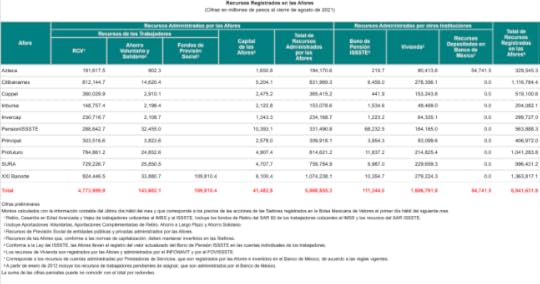 Las 3 más fuertes son XXI Banorte, Citibanamex y Profuturo, con más de 1 millón de millones de recursos registrados; los sigue de cerca SURA con casi el millón, pero no llega. Y luego están las tres más bajas: Inbursa, Invercap y Azteca.