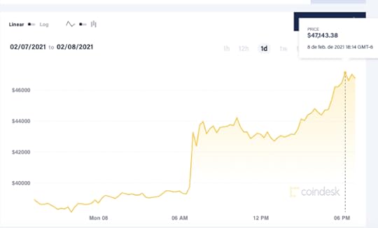 El día de hoy Tesla Inc. anunció la compra de 1,500 millones de dólares en bitcoins lo que hizo que esta criptomoneda llegara a un nuevo máximo histórico por encima de los 47 mil dólares, un 19% arriba de su cierre ayer.