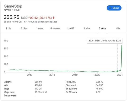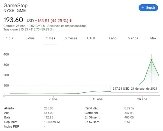 Hoy, las acciones de GameStop siguen moviendose y puedes ver su evolución en tiempo real aquí. Pero el 27 de enero de 2021 una acción de GameShop llegó a costar 347.5 dórales, que no parece tanto pero si consideras que estas acciones estaban siendo vendidas en 17.25 dólares al iniciar el 2021 y que la mayoría estaba en manos de posiciones cortas, la pérdida para los fondos es grande.