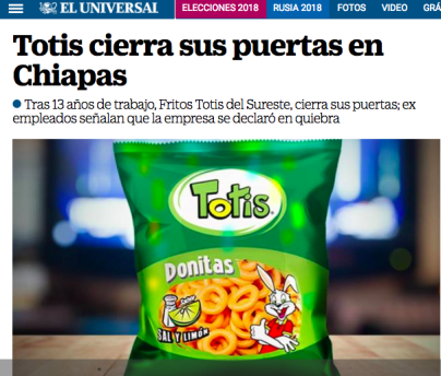 A finales de abril de 2018, la planta de Comitán, Chiapas que abrió en 2005 fue cerrada y, al parecer, los trabajadores fueron informados que la razón del cierre era que empresa había quebrado. Esta había dado trabajo a 200 personas locales para la manufactura de productos Totis y su exportación a Estados Unidos y Centroamérica, pero redujo su personal a la mitad antes del cierre. Aquí la nota que publicó El Universal con esta versión: