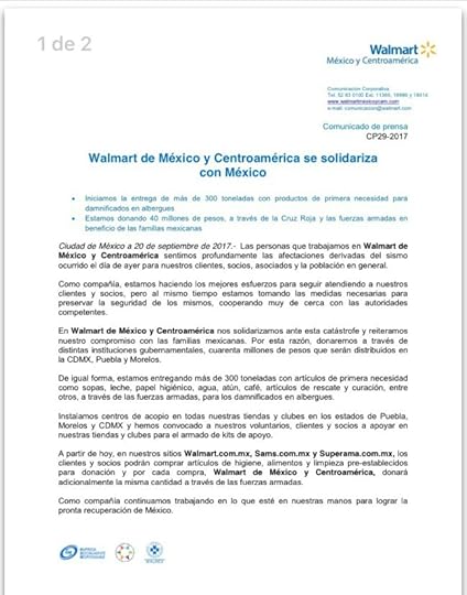 Si quieren donar en especie por la tarde del 20 de septiembre Walmart de México pondrá en todas sus plataformas para compras en línea una lista de productos para donación, y por cada artículo que donen ellos pondrán otro.