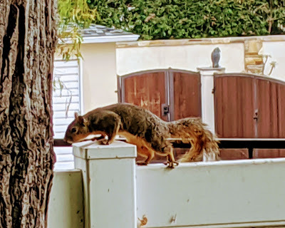 Charlie's a Boston. He acts tough but is all bark and no bite (he's afraid of the neighbor's cat). The squirrel is one and many. All over the place. This morning he greeted me and put on quite a show. I lucked out and got a little rain in CA while walking along Marine Stadium (rowing center side). Pascal told me to be content (happy) in my own room, so I'll hang out inside for the remainder of the day.