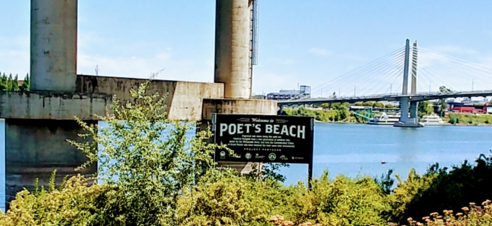 Nicknamed "Poet's Beach", it can be reached via a newly cut path through riprack rock. Along the path are stones engraved with children’s poems that speak for the Willamette River. Also inscribed are native Chinook words provided by the Confederated Tribes of Grand Ronde, who have honored the river since time immemorial. The engraving work was done by Peter Attila Andrusko of Written In Stone Productions.