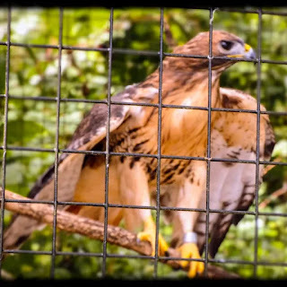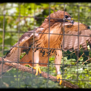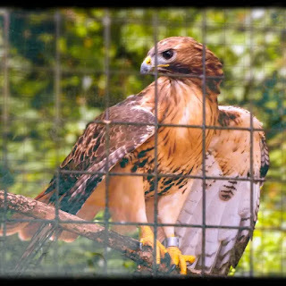 Redtailed Hawks @ WK Kellogg Bird Sanctuary near Kalamazoo MI. Probably about six individuals, from young to old, several with obvious wing problems. These two shared a "cage" and were perhaps the most lively. Hard to be a redtail if you can't fly. TGIF.