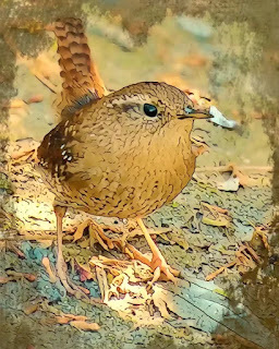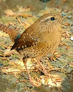 Pacific Wren @ La Mirada Community Park (pics #1 & #2) and, for comparison, the Winter Wren @ Mom's house in Michigan (#3 & #4). I was in La Mirada from 9 to 2 waiting for the little PW (Troglodytes pacificus) to exit its "cave." Finally I made one last attempt at playing the audio ebird call (along the stretch of shrubs he's known to frequent) and he came out, darting up and down the length of his kingdom, once flying up to the tree. Behavior-wise very much like his Eastern cousin. Amazing!!! TGIF.