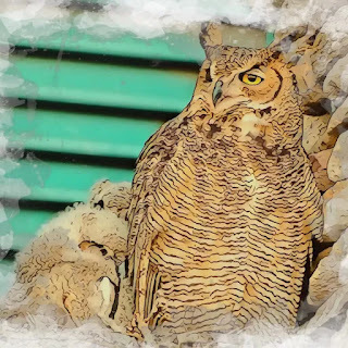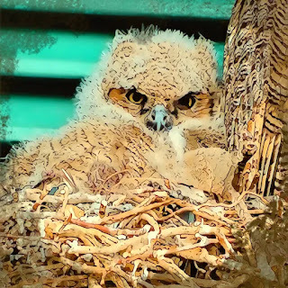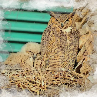 Great Horned Owl Family in Southern California (a bit north of LA). Probably the Momma and two Smurfs (the more the sun rose the more they snuggled -- not good for great pics). Still, a wonderful sight. Have a great week wherever you are.:)