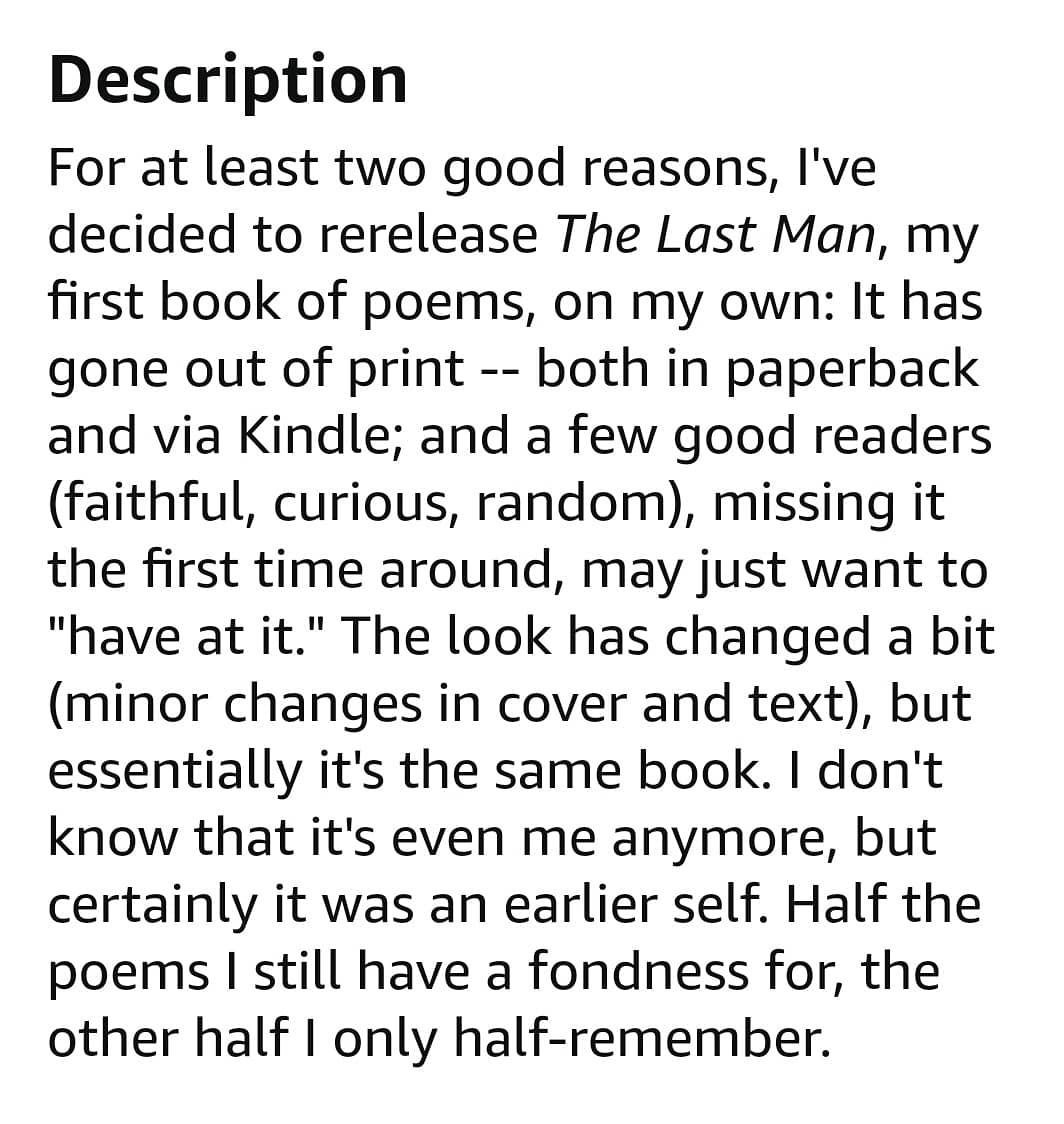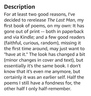 I've decided to rerelease my first book of poems, The Last Man. If you didn't get a chance to purchase it a millennium ago (2012), well, it's back in print @ Amazon. And the Kindle eBook will soon follow.