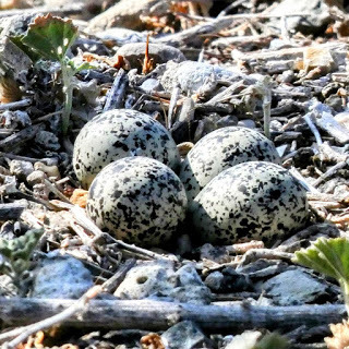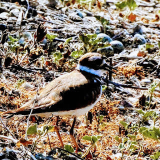 Nesting Killdeer @ San Joaquin M & W. #1.) Mom takes some time to stretch her legs; #2.) Mom never strays far from the nest (Can you spot the speckled eggs behind her and to the right?); #3.) Here are the four eggs with magic, not chocolate, inside.