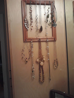 I also needed something for my necklace collection. I took the largest frame and hammered in a bunch of nails. This looked terrible when done, I confess. But once hung on the wall and adorned with necklaces, it looked super cool!
