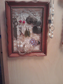 I needed a scrap of lace and surprisingly, had none. Not the teensiest bit. Not a smidge. Not even a tad bit of lace ribbon. I had seen something on pinterest with a empty picture frame (of which I have several that languish sadly in my cupboard because my hubby called them creepy hanging on the wall). Behind the picture frame is either ribbons of lace, or just lace. This lace is perfect for earrings. I used a mixture of nails and fabric glue to stick it into place. I also may or may not have glued my fingers together.