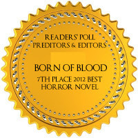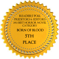 Born of Blood finished 5th in the Best Horror Novel category of the 2012 Preditors and Editors Readers' Poll. To finish in the top 5 of this readers' poll when 57 novels were nominated is both an honor and a privilege. I thank all of you for voting. This is very exciting.