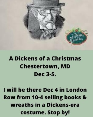 I will also be (along with my husband in Dickens-era costumes) at the annual A Dickens of A Christmas in Chestertown, MD on December 4 in London Row from 10 a.m. – 4 p.m. selling my books and handmade book pages wreaths.
