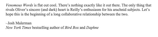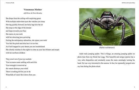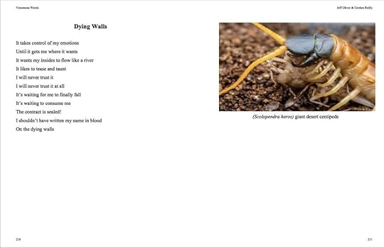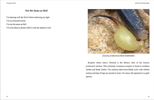 “The poetry and photography in Jeff Oliver and Gordon Reilly’s Venomous Words draw you into a beautifully dark and rarely seen world. Reilly’s stunning photography of scorpions and other invertebrates are gorgeous, haunting, and fascinating. Oliver’s poetry dives deep into the more macabre philosophies of the human struggle. He doesn’t flinch! A wild and unique collaboration! Loved it!”
