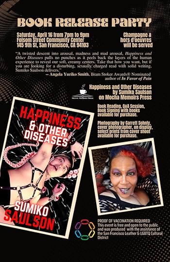 If you’re in San Francisco on Saturday, April 16th between 7pm and 9pm, I would like to invite you to the book release party for “Happiness and Other Diseases,” which is coming out on Mocha Memoirs Press on March 30. The book release party, which is being put on in conjuction with the LEATHER & LGBTQ Cultural District, will feature champagne and hors d’oeuvres, as well as a book reading, book signing with books available for purchase at $15 each. If you bring a book with you, I can also sign that.