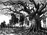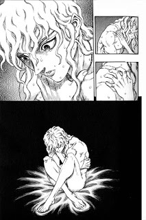 Guts survives.What happens next is so disturbing, I'm not even going to show it. The reborn Griffith then rapes Casca in a pool of their former comrades blood. Yeah, he has Demon's hold her down and everything. And in the Manga, you see it in explicit detail. This was one part of the story I really didn't understand for a while. Why did he do it? My friend who is a Berserk fanboy tried to pass it off as part of the ritual that turned him into a demon, but that's a fat load of BS. Why? Because his transformation was already complete when he did it, that's why! And where was Guts while this was going on, you might ask? Well he did try to stop it, he had to sever his own arm to do so. But he was then pinned down and forced to watch with one of his eyes gouged out. Now, from a narrative standpoint, this whole horrific chapter can be seen as a rebirth of Guts, Casca and Griffith. Well, ok, Griffith's rebirth isn't so much of a rebirth as it is his true self being manifest. He was always this evil, but now that evil has come out, and he is ready to unleash it upon the world. Guts rebirth is more symbolic, he was born amidst blood and death, and him surviving this can be seen as him being born again as an embodiment of rage that he becomes later in the series. It's a rebirth of Casca because, well, after this her mind is destroyed, reduced to the cognitive functions of a child to block out the events. And it can been seen as her character coming full circle. She was saved from being rapped by a nobleman by Griffith. Hell, she was practically raised by him. She idolized him, and this is how he repays her loyalty, by ruining her like that nobleman tried to do all those years ago. There are some fans out there who say that Casca actually LIKED what Griffith does to her. If you're one of those people, get away from my blog, YOU'RE A FUCKING PIG! But this brings us back to my original question, Why did Griffith rape her? Well the answer is that he did it out of spite. He saw what Casca and Guts meant to each other, and how he had lost his control over them, and how they didn't need him anymore. And this one act of sexual violence is him reasserting his authority over both of them in the most painful and brutal way possible. Guts and Casca do escape, and shortly thereafter, Guts begins his quest for revenge.
