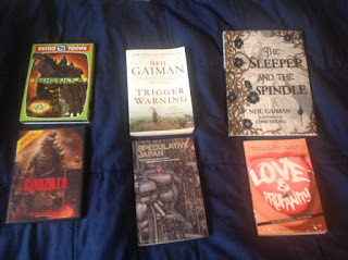 Top row: Godzilla the animated series DVD, Trigger Warnings by Neil Gaiman and The Sleeper and the Spindle by Neil Gaiman and Chris Riddell.Bottom Row: Godzilla (2014) DVD, Speculative Japan Volume 3 (short story anthology), Love and Profanity (short story anthology).