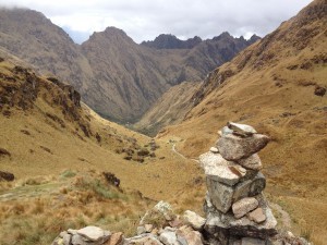 Get up and eat some fruit and scrambled egg variation in the communal tent. Start walking. Admire a set of ruins that appear to teeter precariously at the edge of a precipitous drop. Wonder what on earth possessed the Inca to build at such heady heights and marvel at their craftsmanship. Walk some more. Get overtaken by a Chaski with a pack three times the size of mine. Try to catch up to the Chaski to prove my physical prowess. Fail to catch up with him, but convince myself that I’ll catch him later in the day. Day dream about eating jam donut. Get rained on. Walk more. Get a blister. Have lunch in the communal tent. Stare lovingly at the mountains as the sun breaks through the cloud cover. Swear when it starts raining again and a raindrop hits me in the eye. Walk a lot more. Eat a fish dinner with some delicious brown stuff. Sleep well.
