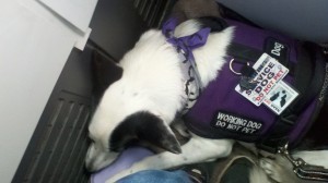 Navigating security isn’t as horrible as the media advertises. Liquid restrictions and the taking off of shoes is a pain; but it’s just part of the process. On the upside you don’t have to stand in those long, long security lines. Look for a sign that says, “Crew or Passengers needing extra assistance.” These lines are generally shorter and will help accommodate your needs. To enter, hand them your boarding pass, ID and Service Dog Handler ID. That last one isn’t required; however it helps to have one. Mine is plastic (size of a credit card) has my countries flag, the names of myself and my Service Dog as well as our photos. On the back is printed the U.S. Federal Law about ADA Act, along with phone numbers and website address for the Department of Justice. Occasionally this ID has been photocopied, along with her vet papers, when we’ve flown internationally.