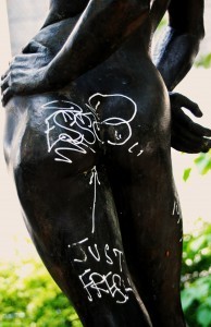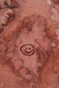 A fellow beach goer was eager to point out the lizard in the cliff at Tulum Ruins. Another hiker ahead of me at Canyonlands National Park drew the smiley face in the mud. Someone–or possibly two people–wrote on the butt of that parks statue in Paris. The healing wound is my horses skin two months after being attacked by a bear in Alaska. And the shredded tire brings back the smell of burnt rubber in Moab.