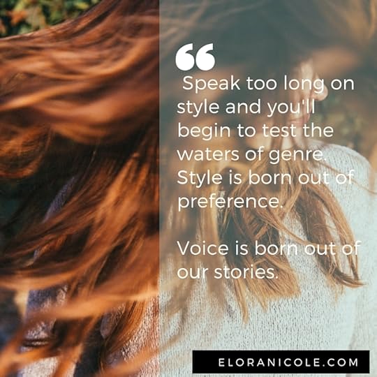 It's different than style. I may try on a style that's separate from one I've exhibited before: technical writing, poetic verse, creative nonfiction. Speak too long on style and you'll begin to test the waters of genre. Style is born out of preference.