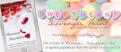 The Sweetheart Scavenger Hunt is January 25 - February 14. Starting Friday, Jan. 25, visit each participating author's blog and find the hidden candy heart clue. It will look something like this: