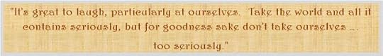 Humour is a wonderful defensive shield against most of the world's travails. There have been some seriously very dark moments in my life, and always, humour, even black humour, has helped me through these. I can laugh at most things, and love the fact that most importantly, I can laugh at myself. Please God, prevent me from ever taking myself too seriously.