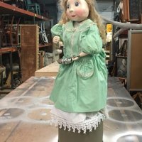 Eric Hart built an automaton that moves its arms, dips a wand into soap, and brings it to her mouth to blow bubbles.