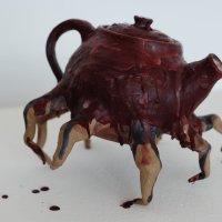 Sarah Duyer's series of teapots and cups, fittingly titled "Comfort/Discomfort," seem as if they're crawling away on insectoid legs.