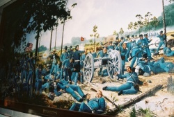 Where the battle took place is now called the Dade Battlefield Historical Park. It’s a beautiful site with a small museum, a replica of the meager log fort erected by Dade’s troops, and markers showing where Dade and some of his advance party fell. The mural at the top of this blog is the work of Florida artist Jackson Walker . It shows Major Dade’s men in the midst of battle and is located in the museum.