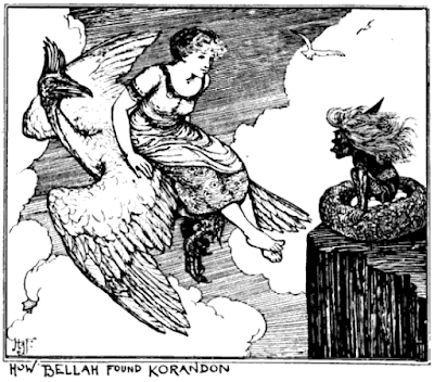 As soon as she had finished, wings sprouted from the horse’s sides and he turned into a great bird which carried her easily to the summit of the rock. Here at the top she found a nest made of clay and line with dried moss, and in the middle of the nest was a tiny little korandon, all black and wrinkled, who cried out,