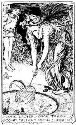 Another dark fairy tale: this is a Flemish story, 'La Fileuse d’Orties', from ‘Contes du roi Cambrinus’ (1872) collected by Charles Deulin. The English translation was made by Leonora Blanche Alleyne (Mrs Andrew Lang) for ‘The Red Fairy Book’, and it's a strange, sinister story which takes the old theme of the girl who weaves nettle shirts, and stands it on its head. You'll remember tales such as Hans Andersen's 'The Wild Swans' and the Grimms’ ‘The Twelve Brothers’ in which the heroine spins and weaves nettle shirts to disenchant the brothers she loves. (A similar healing magic is performed by 'Gilla of the Enchantments': #6 in this series.) But when the heroine of this story tells a wicked count that she prefers marrying her sweetheart to succumbing to his wiles, the count effectively responds, ‘Over my dead body!’ and orders her to perform what he assumes will be the impossible tasks of weaving a nettle wedding-gown for herself, and for himself, a nettle shroud. Of course it isn't impossible, and as she steadily spins the nettles and weaves the shroud, he begins to sicken…