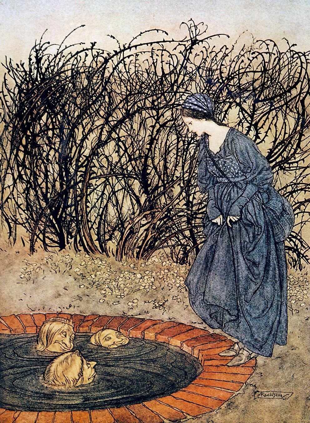 The Three Heads in the Well In the English fairytale ‘The Three Heads of the Well’ an old man advises a princess how to get through a thicket of thorns. Hidden beyond it is a well. ‘Sit down on the brink, and there will come up three golden heads, which will speak, and whatever they require, that do.’ The heads sing:Wash me and comb meAnd lay me down softlyAnd lay me on a bank to dryThat I may look prettyWhen somebody passes by.