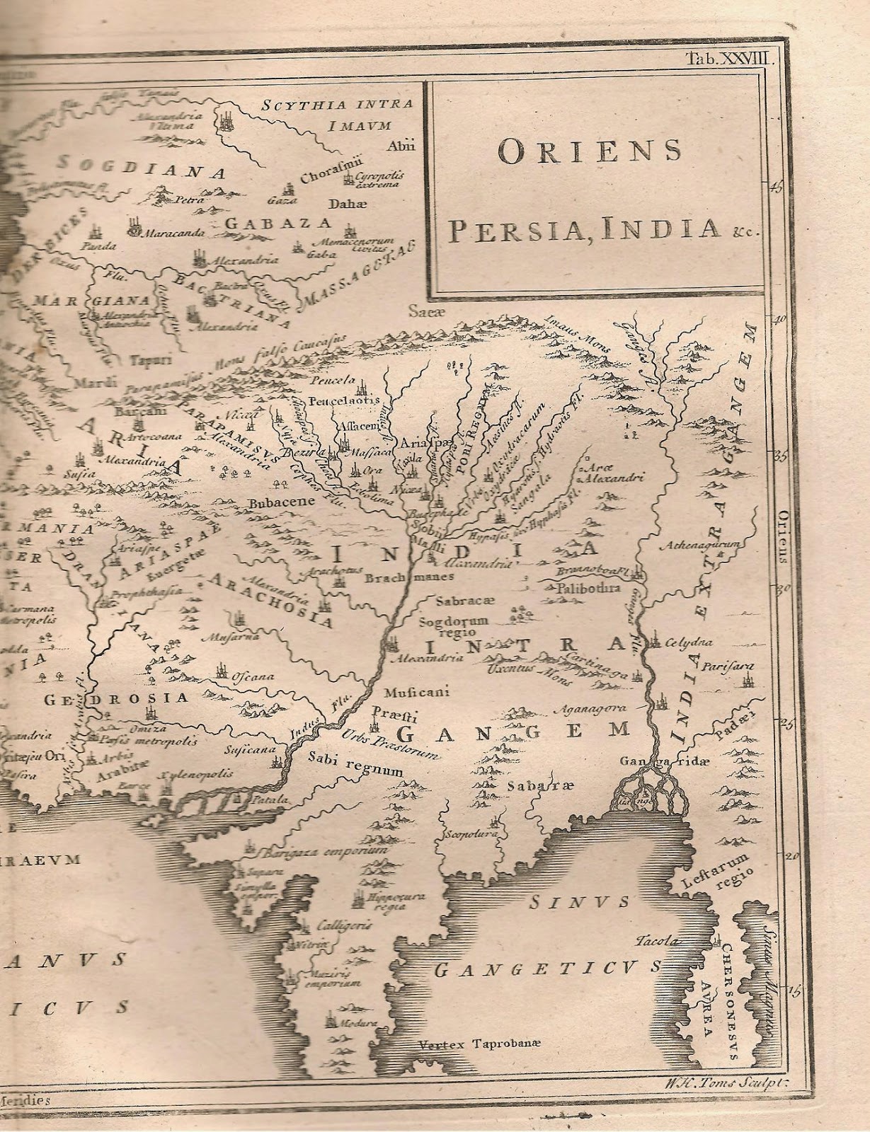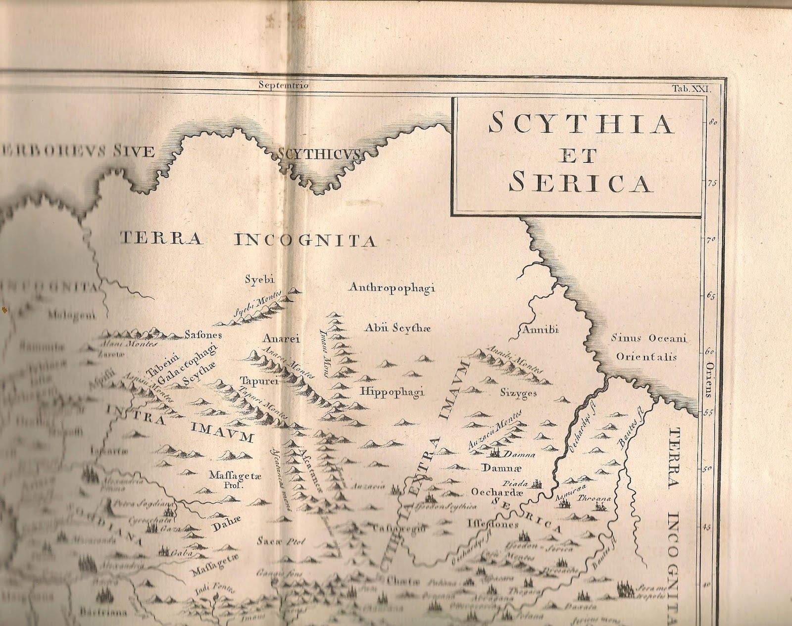 Wow. They have only one eye and still succeed in stealing gold from griffins? But here they are, if you can make out the name: the ARIASPAE [sic] and Euergetae, halfway down the map on the left-hand side. By that way, that graceful curve of mountains just below the legend at the top is named as the Parapamisus Mons and Imaus Mons. That's the Hindu Kush.