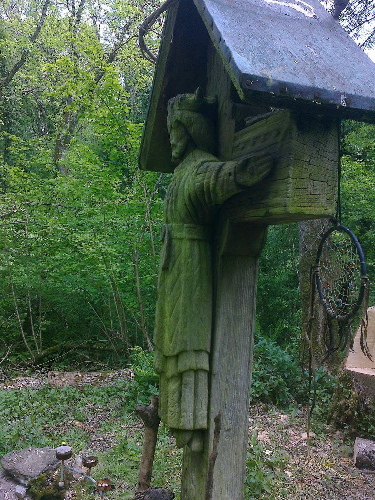 Bluebells and ferns sprang from the stones of the altar, and someone had hung a dream-catcher from the crucifix. In the earth floor of the chapel were three grave-slabs, recent burials from the mid 1940s, presumably of some previous owners of the wood. 'And in that sleep of death, what dreams may come...?' Maybe the dream-catcher helps. Or maybe in this woodland setting, they sleep sound.
