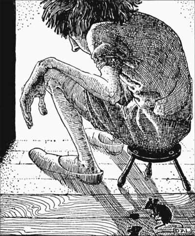 A strange sound crept into Peer’s sleep. He dreamed of a hoarse little voice, panting and muttering to itself, ‘Up we go! Here we are!’ There was a scrabbling like rats in the rafters, and a smell of porridge. Peer rolled over. ‘Up we go,’ muttered the hoarse little voice again, and then more loudly, ‘Move over, you great fat hen. Budge, I say!’ This was followed by a squawk. One of the hens fell off the rafter and minced indignantly away to find another perch. Peer screwed up his eyes and tried to focus. He could see nothing but black shapes and shadows. ‘Aaah!’ A long sigh from overhead set his hair on end. The smell of porridge was quite strong. There came a sound of lapping or slurping. This went on for a few minutes. Peer listened, fascinated. ‘No butter!’ the little voice said discontentedly. ‘No butter in me groute!’ It mumbled to itself in disappointment. ‘The cheapskates, the skinflints, the hard-heared misers! But wait. Maybe the butter’s at the bottom. Let’s find out.’ The slurping began again. Next came a sucking sound, as if the person – or whatever it was – had scraped the bowl with its fingers and was licking them off. There was a silence. ‘No butter,’ sulked the voice in deep displeasure. A wooden bowl dropped out of the rafters straight on to Peer’s head.