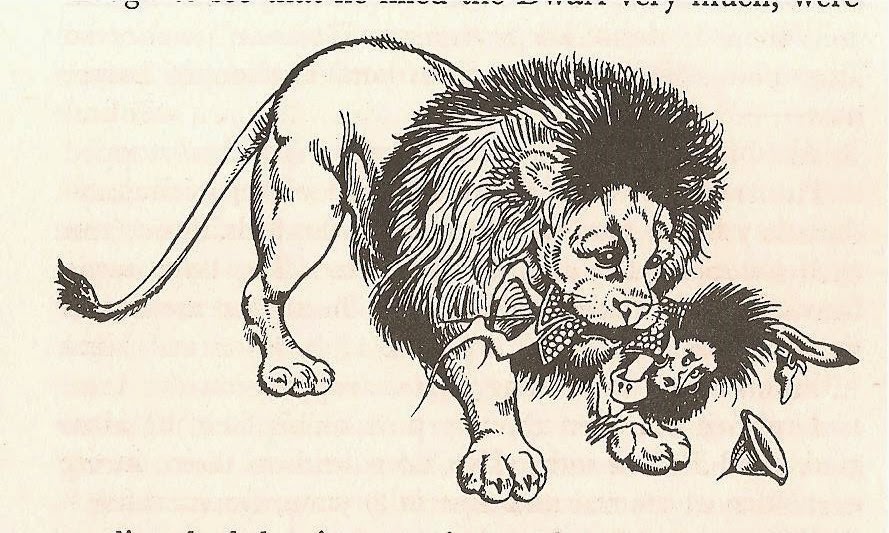 This book of spells is Lucy’s test and like Eustace-the-dragon and Caspian, she fails it. Once again Aslan has to intervene, his painted face appearing on the page ‘growling, and you could see most of his teeth’. Frightened, Lucy turns the page only to gabble another, lesser spell that ‘would let you know what your friends thought about you’, which teaches her the age-old lesson that listeners never hear good of themselves. Next comes a spell ‘for the refreshment of the spirit’, and finally the one she’s looking for, ‘A Spell to make hidden things visible’. On repeating it, Aslan himself appears,in tender but chiding mood – the Magician is revealed to be a sort of benign exiled Prospero, and we meet the Duffers or Monopods.