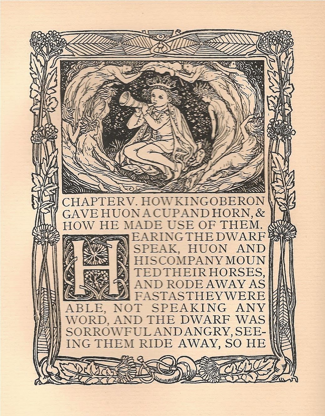 …the dwarf of the fairies, King Oberon, came riding by, wearing a gown so rich that it were marvel to recount… and garnished with precious stones whose clearness shone like the sun. He had a goodly bow in his hand, and his arrows after the same sort, and these had such a property that they could hit any beast in the world. Moreover, he had about his neck a rich horn, hung by two laces of gold… and whosoever heard it, if he were a hundred days journey thereof, should come at the pleasure of him that blew it. … Therewith the dwarf began to cry aloud and said, ‘Ye fourteen men that pass by my wood, God keep you all. I desire you to speak with me, and I conjure you by Almighty God, and by the Christendom that you have received, and by all that God has made, answer me.’Hearing the dwarf speak, Huon and his company…rode away as fast as they were able, and the dwarf was sorrowful and angry, so he set one of his fingers on his horn, out of which there issued a wind and a tempest so great that it bore down the trees. …Then suddenly a great river appeared before them that ran swifter than the birds did fly; and the water was black and perilous…Huon of Bordeax, trans. Lord Berners, retold by R Steele