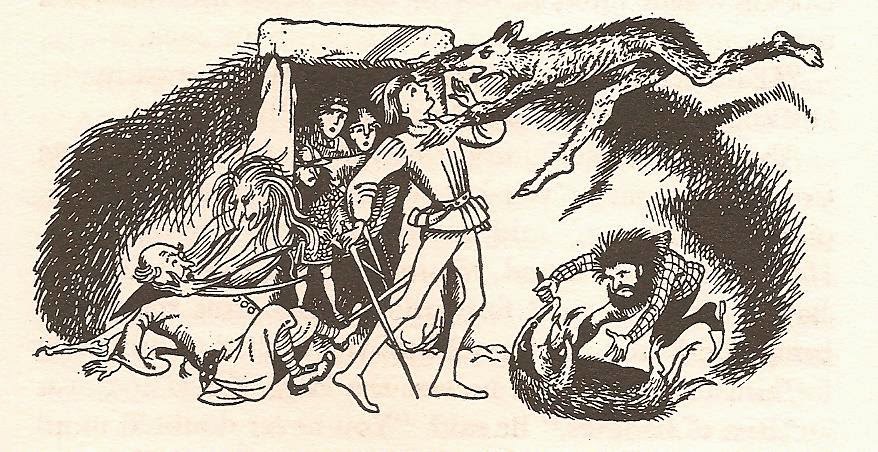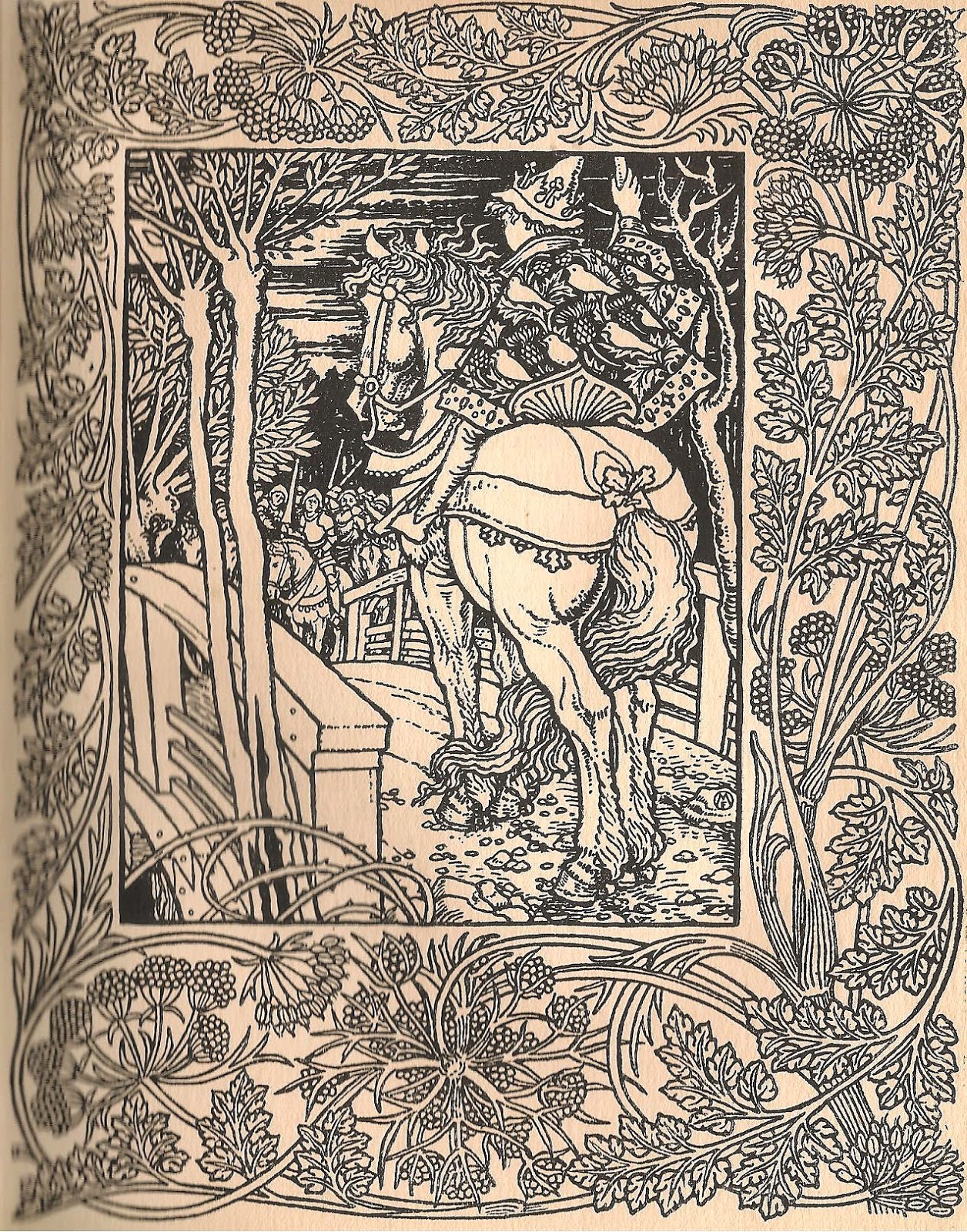 Then said King Peter (for they talked in quite a different style now, having been Kings and Queens for so long), ‘Fair Consorts, let us now alight from our horses and follow this beast into the thicket, for in all my days I never hunted a nobler quarry.’ ‘Sir,’ said the others, ‘even so let us do.’