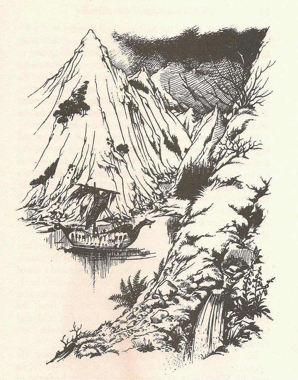 Eastwards – beyond the sun – was a range of mountains. It was so high that either they never saw the top or they forgot it. None of them remembers seeing any sky in that direction. And the mountains must really have been outside the world. For any mountains even a quarter or a twentieth of that height ought to have had ice and snow on them. But these were warm and green and full of forests and waterfalls however high you looked. And suddenly there came a breeze from the east, tossing the top of the wave into foamy shapes and ruffling the smooth water all round them. …It brought a smell and a sound, a musical sound. Edmund and Eustace would never talk about it afterwards. Lucy could only say, ‘It would break your heart.’ ‘Why,’ said I, ‘was it so sad?’ ‘Sad!! No,’ said Lucy.