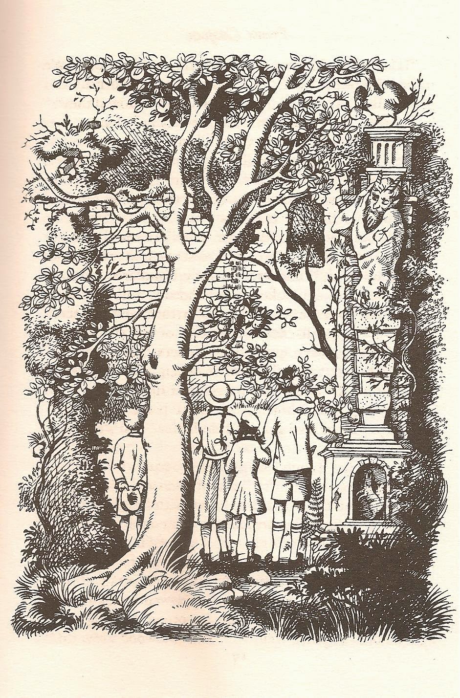 It’s beautifully done. The ‘yellowish-golden’ apples on the ancient trees come with memories of the Hesperides, the secret garden, Eden – anywhere long-loved and lost. Because when the children do finally realise where they are the realisation is laden with melancholy: this is Cair Paravel, but not as it was: their Cair Paravel is gone for ever.