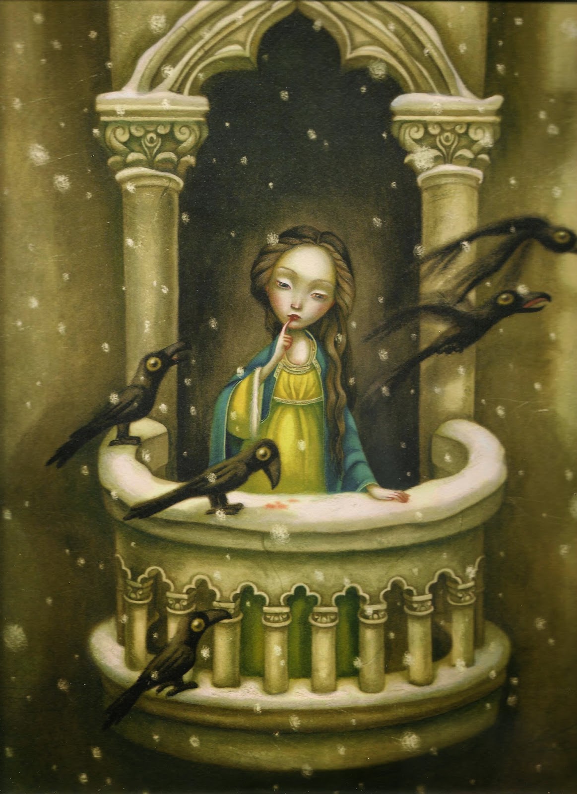 The Queen at her Window: 'Blanche-Neige' illustrated by Benjamin Lacombe, Milan Jeunesse, 2011Once upon a time in the middle of winter, when the flakes of snow were falling like feathers from the sky, a Queen sat at a window sewing, and the frame of the window was made of black ebony. And whilst she was sewing and looking out of the window at the snow, she pricked her finger with the needle, and three drops of blood fell upon the snow. And the red looked pretty on the white snow, and she thought to herself, ‘Would that I had a child as white as snow, as red ad blood, and as black as the wood of the window-frame.’