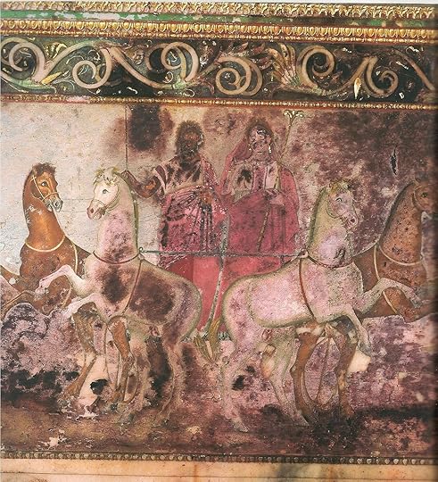 ...while on the back of the throne is a painting depicting Hades and Persephone riding together in triumph on their four-horse chariot. In another tomb at Aegae, Demeter is shown lamenting the loss of Persephone, while on another wall, Hades carries her off. For me, it seems these images are being used in much the same way that we would place a cross on a Christian tomb. They are not merely referencing, but calling upon a significant myth, a myth with immediate, emotional potential, a myth that speaks of life beyond the doorway of death.