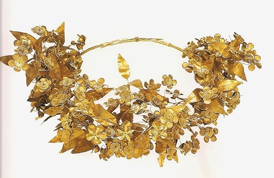 And I wonder, I wonder about that leaf-shape. The goldsmiths of Macedon were unrivalled at creating wreaths – of oak leaves and acorns, or of flowering myrtle that look as though Midas has touched the living plant and turned it to gold. Would such artists really have used any old ‘leaf shape’ – or is this slim slip a gold imitation of the narrow leaf of the willow – the black, ‘fruit-perishing willows’ which Homer tells us fringe the shores of Persephone’s kingdom?