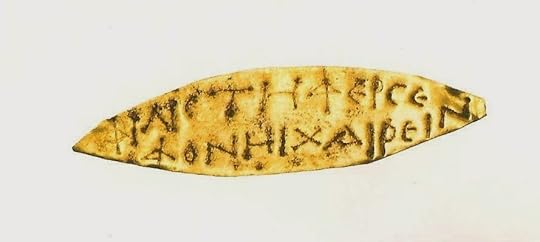 For me, one of the most moving items in the exhibition was this small leaf-shaped band of gold foil, 3.6 cm by 1 cm.  Upon it is impressed the simple message: ΦΙΛΙΣΤΗ ΦΕΡΣΕΦΟΝΗΙ ΧΑΙΡΕΙΝ