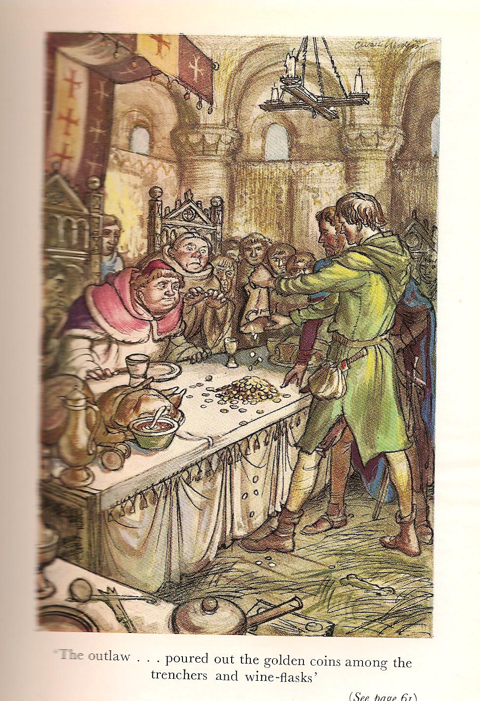 As a child I read all this totally on Robin's side. Robin Hood was Good. That was that. Anything he did was fine. Now, of course, I wonder how much Robin's courtesy sounded like sarcasm to the poor monk, and whether he agreed that it was a 'happy chance' to have his friend shot dead? No wonder that -