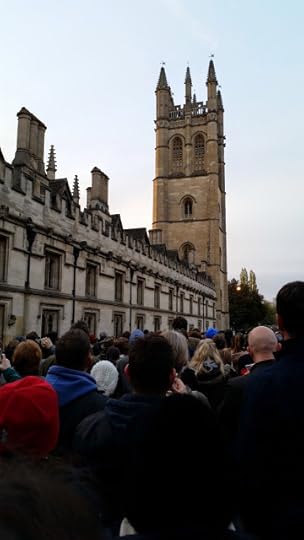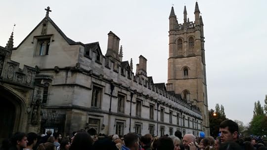 The sky was crimson, every moment changing and brightening towards amber and gold. We found a parking place somewhere near the station and hurried up through the town, which was strangely awake for such a time in the morning. Scattered pedestrians striding purposefully. Cyclists creaking by on ancient bicycles. Groups of worse-for-wear students who’d been up all night, noisy, laughing, hugging one another, stumbling along. Bliss it was in that dawn to be alive, but to be young… All of us heading the same way and for the same reason. Kebab and burger vans on Queen Street were doing a great trade. The air was chill, the buildings still shadowed. Towery city and branchy between towers, cuckoo-echoing, bell-swarmèd, lark charmèd, rook-racked, river-rounded… On the High, a homeless man sat in a college doorway and watched the crowd passing downhill towards Magdalen College and its bell tower.