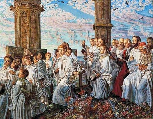 As the crowd around the base of the tower became thicker, we came to a halt among a happy bunch of May morning sightseers – many in May costumes, crowned with real flowers and greenery. Tipping our heads back, we could just see the white robes of the choir moving between the finials of the tower top, and imagine the scene up there as Holman Hunt depicted it in his painting ‘May Morning on Magdalen Tower’. (Did they really scatter a carpet of flowers for the boys to tread upon?)