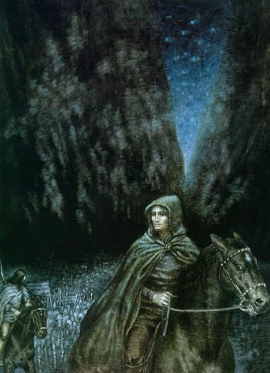 For me, Tolkien’s far more restrained treatment is more effective (and it’s easy to forget that in the book, Aragorn and his friends are also accompanied by a troop of the Dunedain, and Elladan and Elrohir, the two sons of Elrond). And the bargain between Aragorn and the Dead doesn't occur underground. The company passes through the dark tunnels under the mountain with the invisible, menacing host following at their heels; they emerge on the other side into a blue dusk and then ride for another whole day all the way up through Morthond Vale to the ancient Stone of Erech, where prophecy has decreed the oath-breaking dead must one day come. Here is a lightly abridged version of what happens next: