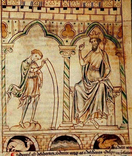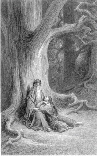 "And at a certain time, as the narrative shows, it happened that Gwenddydd saw certain rare dreams on various nights. All these she carefully retained in her memory until she should find a place and time to relate them to Myrddin her brother. Against that time Gwenddydd prepared bread and butter on a herb cake of wheaten bread with various drinks in various vessels, every drink in its grade as its nature demanded, as wine in silver, and mead in a horn, and the beer in sycamore, and the milk in a white jug, and the water in an earthen jug. All these she placed in order besides the bread and butter inside the harbour to which Myrddin was wont to come, when he was in his senses, to take his nourishment."